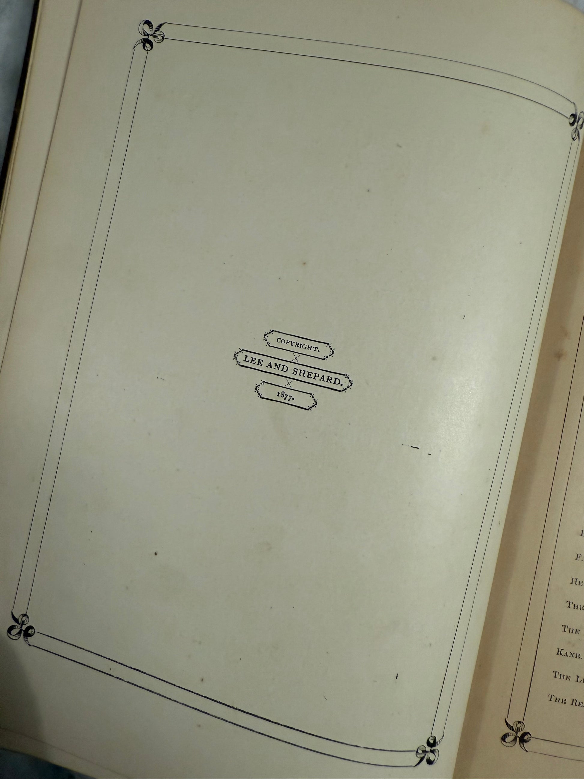 “Ballads of Bravery,” published by Lee and Shepard in 1877. This is an illustrated anthology collecting poems and stories about heroism, valor, and noble deeds, often centered around historical or legendary moments. The collection features work by George Melville Baker and is known for its detailed engravings, including dramatic scenes such as a daring ride or courageous rescue.
