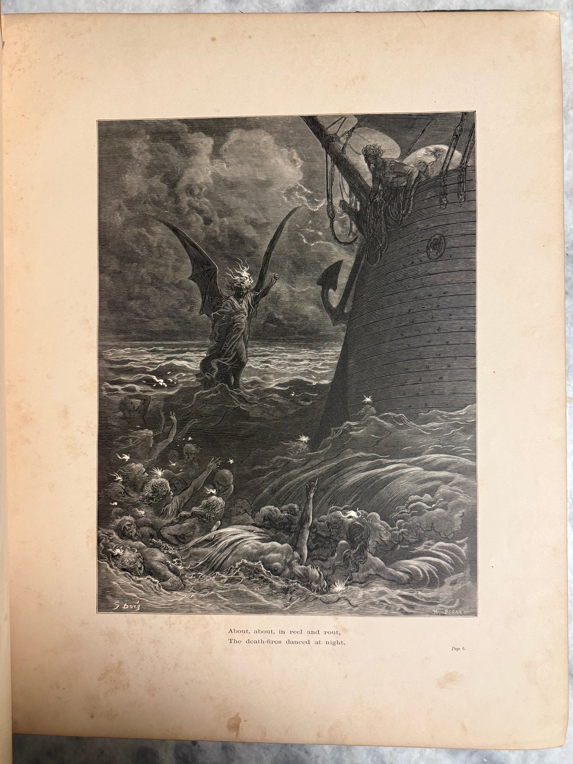 Rare collectible- Gustave Doré’s engravings for “The Rime of the Ancient Mariner” are widely celebrated for their dark romanticism, dramatic energy, & deep symbolism. He created 38 haunting plates that visually interpret Coleridge’s epic poem, bringing its supernatural voyage to life with swirling seas, ghost ships, & spiritual beings. Doré’s style is known for its emotional intensity, intricate detailing, & ability to portray both terror & redemption, elevating the moral & philosophical dimensions of Coleridge’s work.