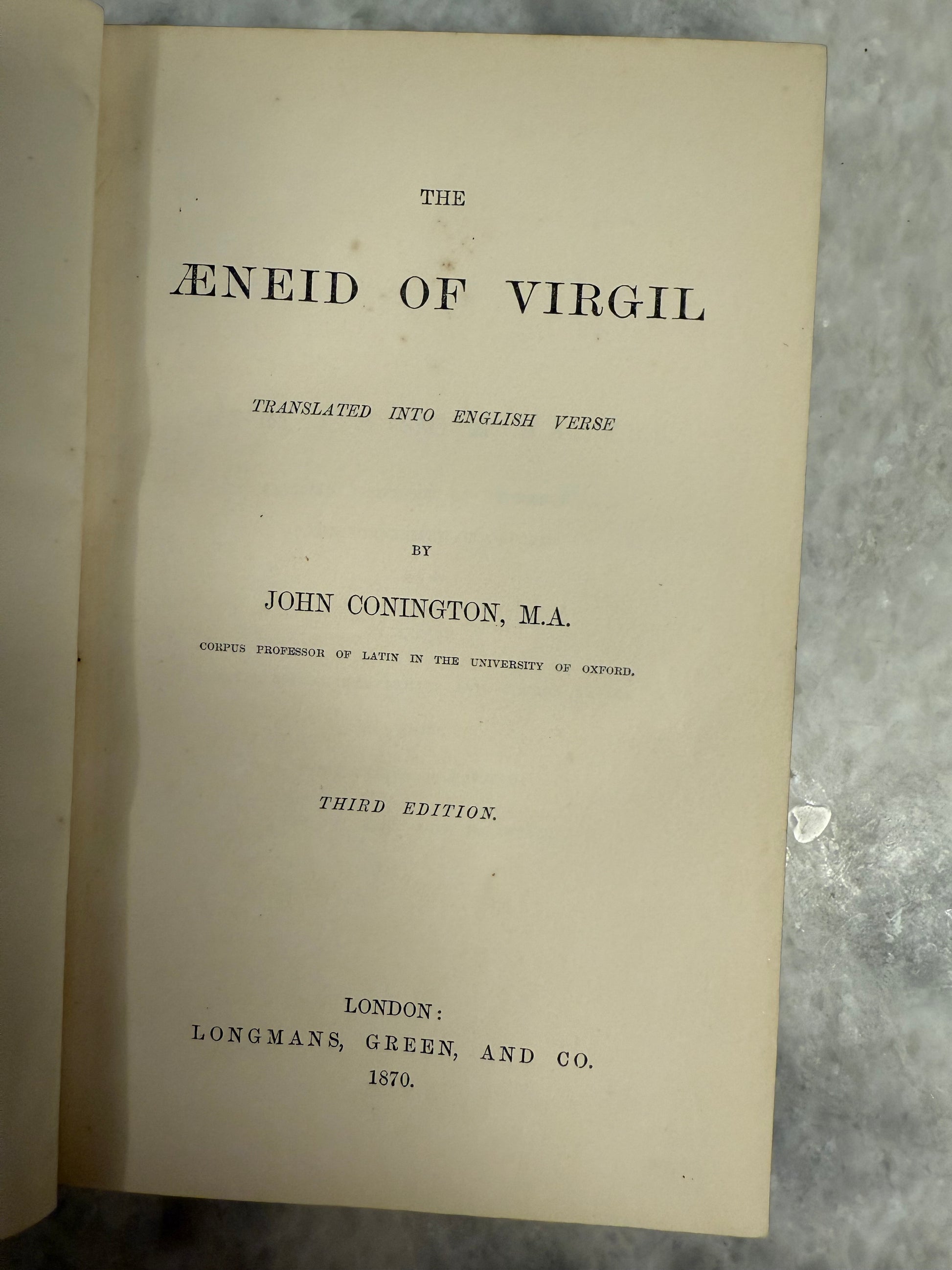 This is a third edition (1870) copy of “The Æneid of Virgil,” translated into English verse by John Conington and published by Longmans, Green, and Co., London.