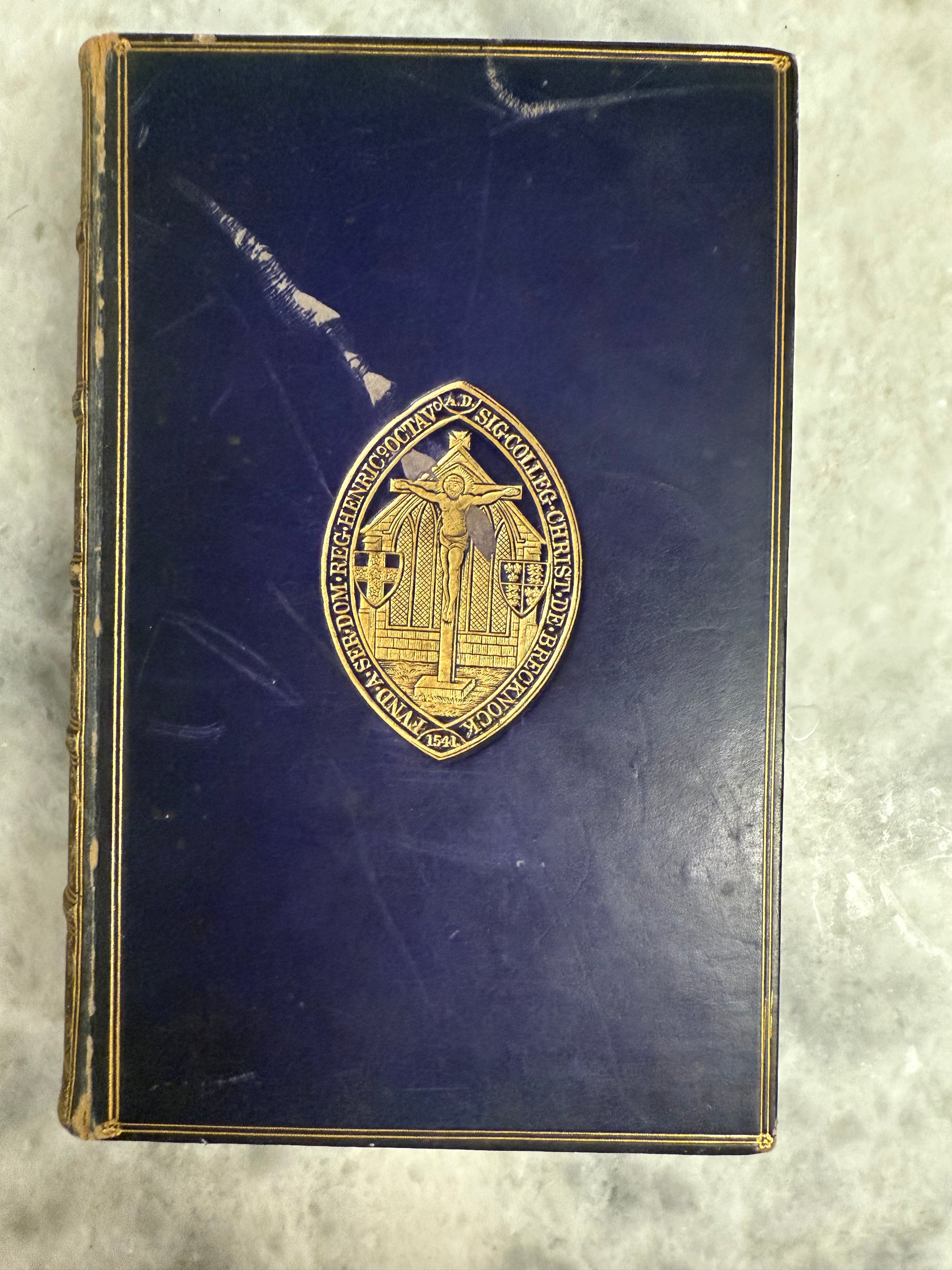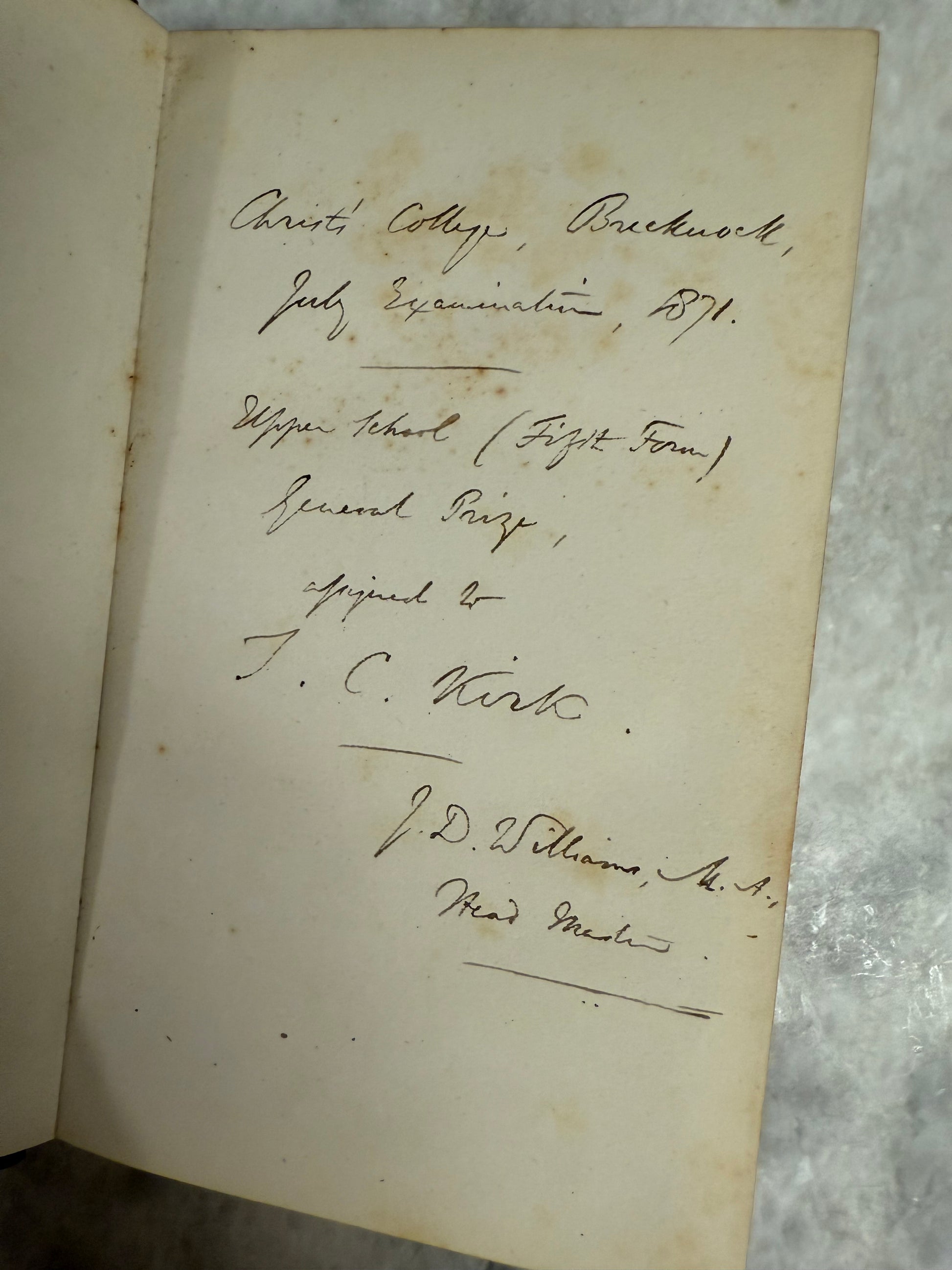 It features full leather prize binding with gilt Christ Church armorial on the cover, marbled endpapers, and an inscription indicating it was awarded as a prize at Christ’s College, Brecknock in 1871.